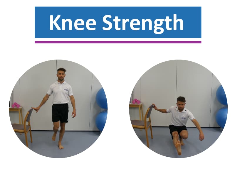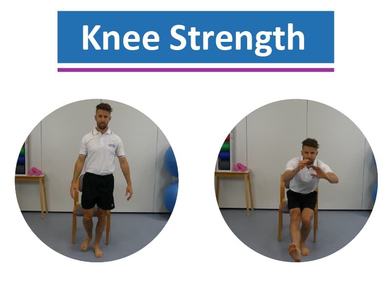 Standing: Place a chair behind you. Slowly lower you bottom down to the chair, briefly touch your bottom to the chair (do not sit down) and rise up.