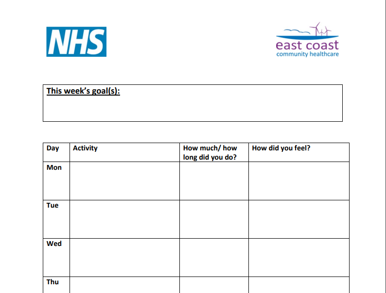 • Plan and record: It also helps to plan and record your activity so that you can monitor your progress. There is a record sheet you can print off at the bottom of this page or you may wish to develop your own. A starting point may be simply keeping a record of your activity so that you can identify where you may need to focus your pacing.