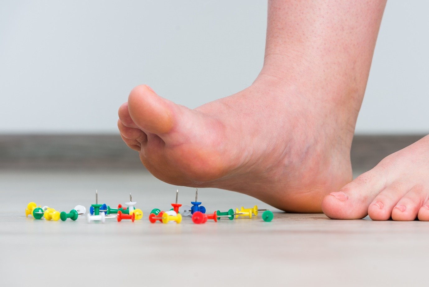 Avoid being barefoot and use a wider fitting trainer with cushioning